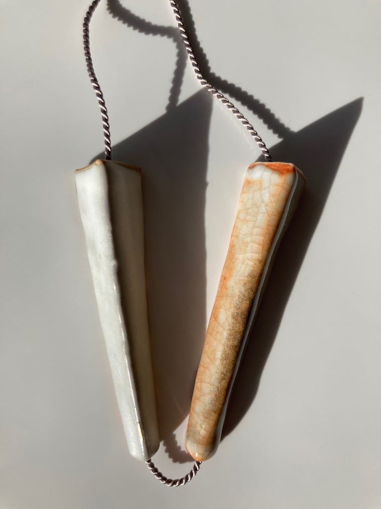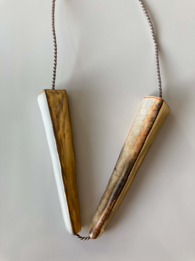 Stoneware and porcelain necklace, 24k gold luster, silk chord in cloud